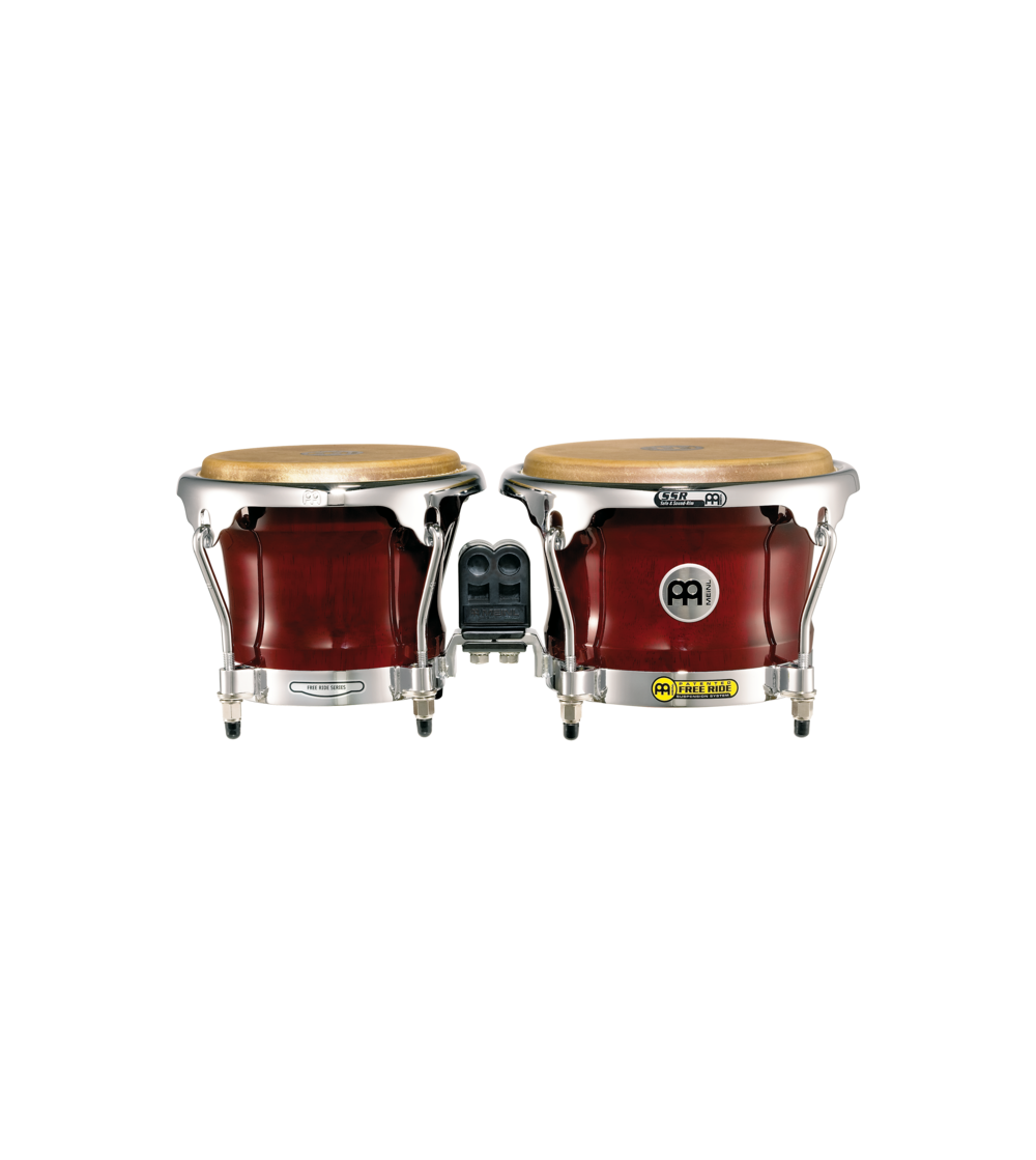 "Set de bongós acabado Cherry Red (7"" y 8 1/2""). Serie Profesional. Un excelente bongo con el innovador sistema Free Ride que no perfora los cascos aumentado así la resonancia y volumen. El cuerpo es de madera roble de Siam y los parches de piel de búfalo seleccionada a mano. Además montan una pieza central patentada y de plástico que permite una sujeción total al pie de bongó si se requiriese.
